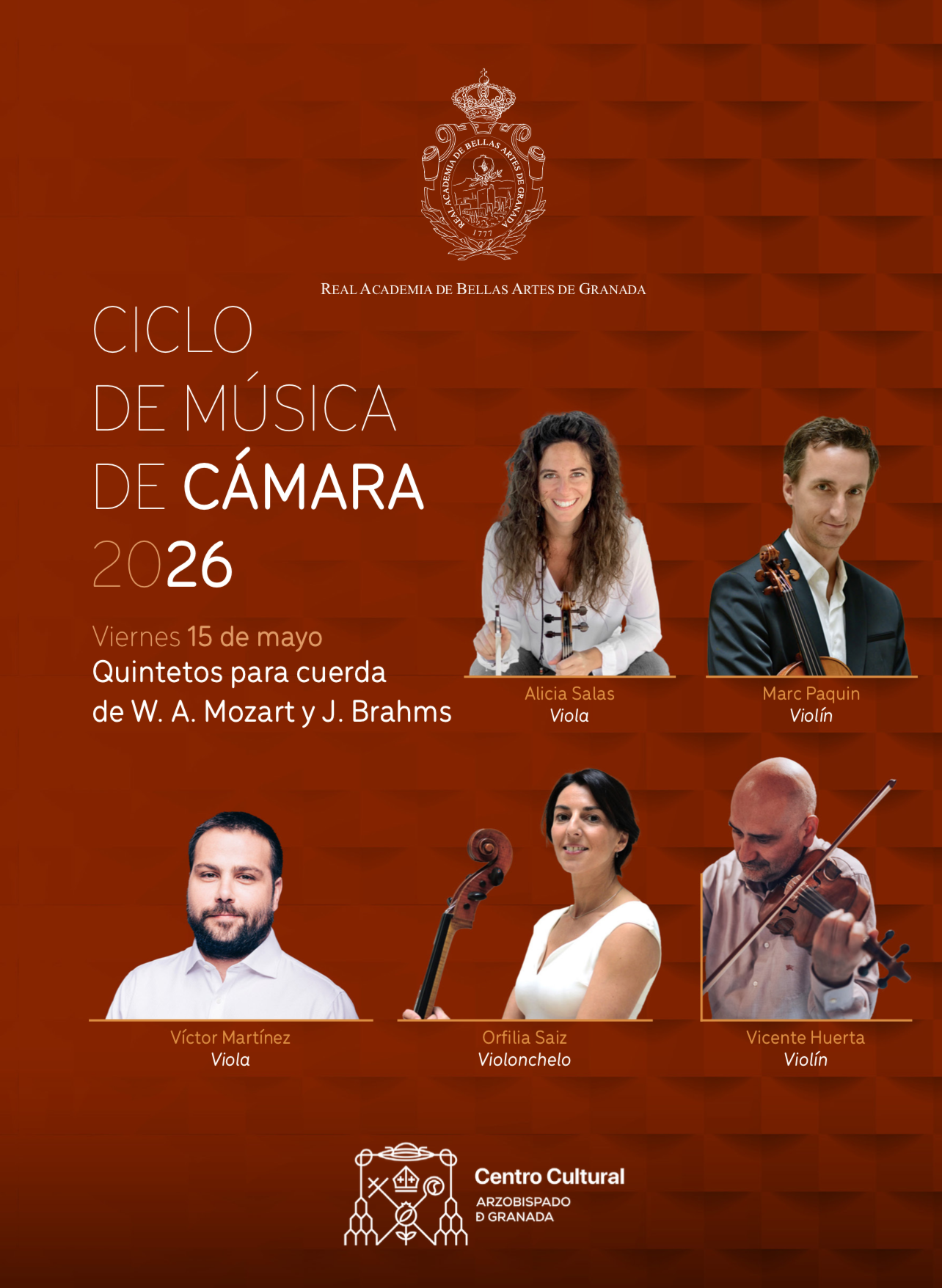 Este curso 2025 – 2026 la Real Academia organiza, en colaboración con el Centro Atístico, el Centro Cultural Arzobispado de Granada, la Diputación de Granada y el Auditorio Manuel de Falla, el segundo ciclo de Música de Cámara integrado por tres conciertos.